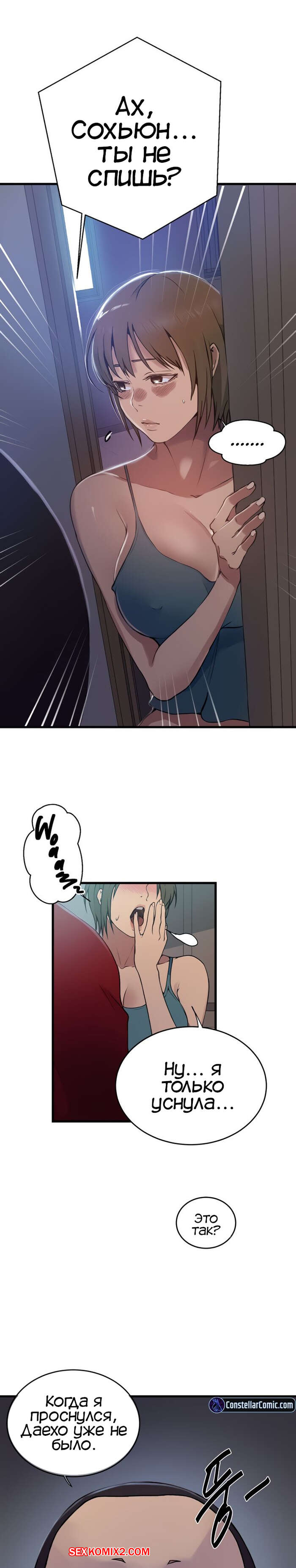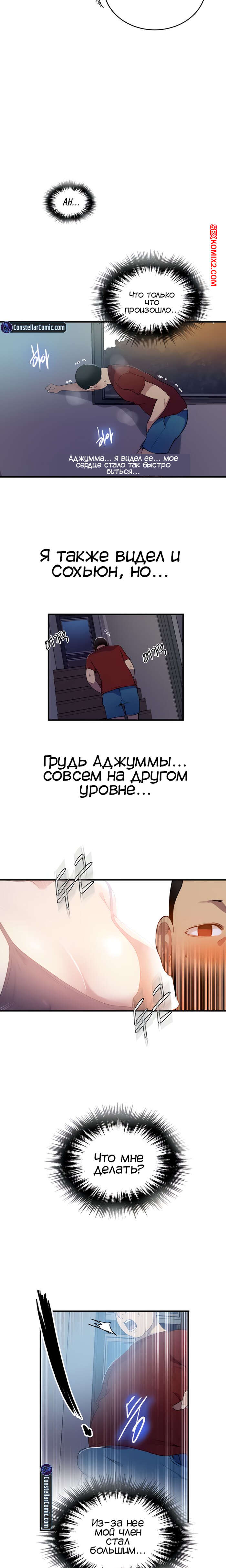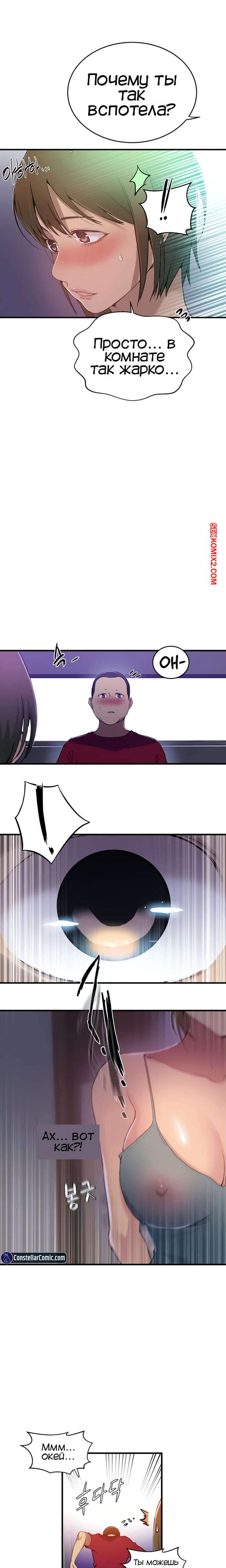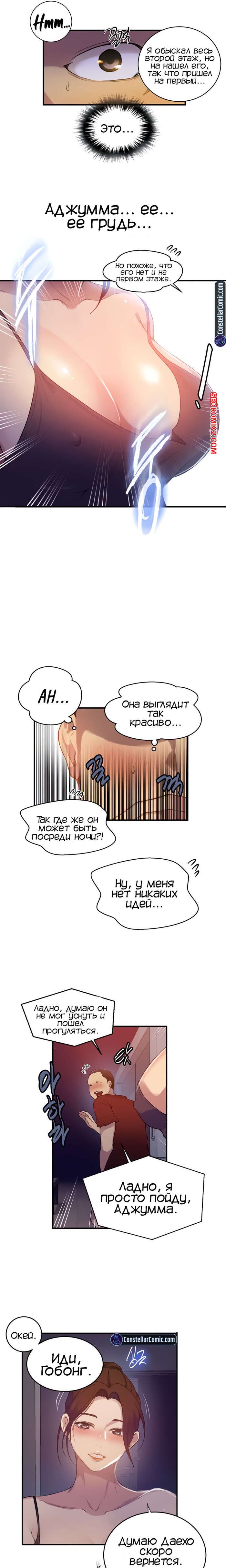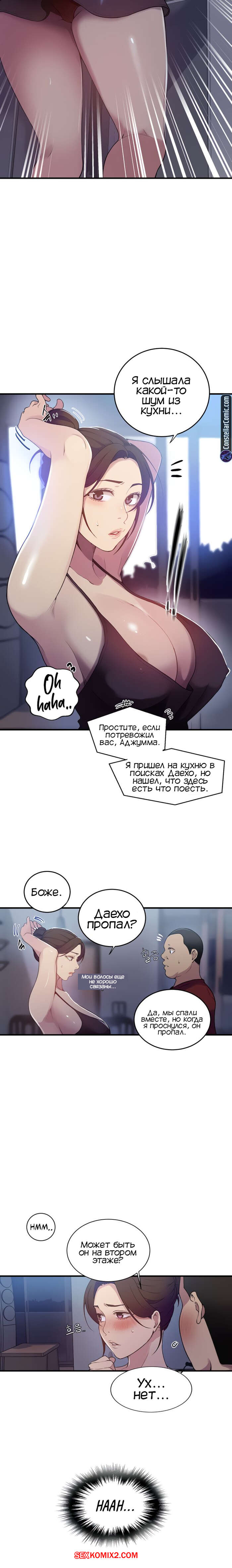 Порно комикс Тайное обучение. Часть 181. Secret Class. Парень остался с ночевкой у своего друга. Ночь в доме он встретил сексуальную милфу с торчащими сосками. Это была тетя его друга, парень возбудился так сильно, что из носа пошла кровь.