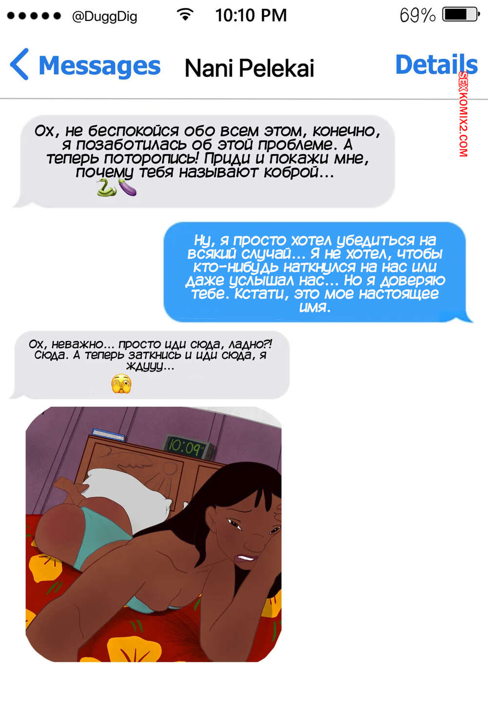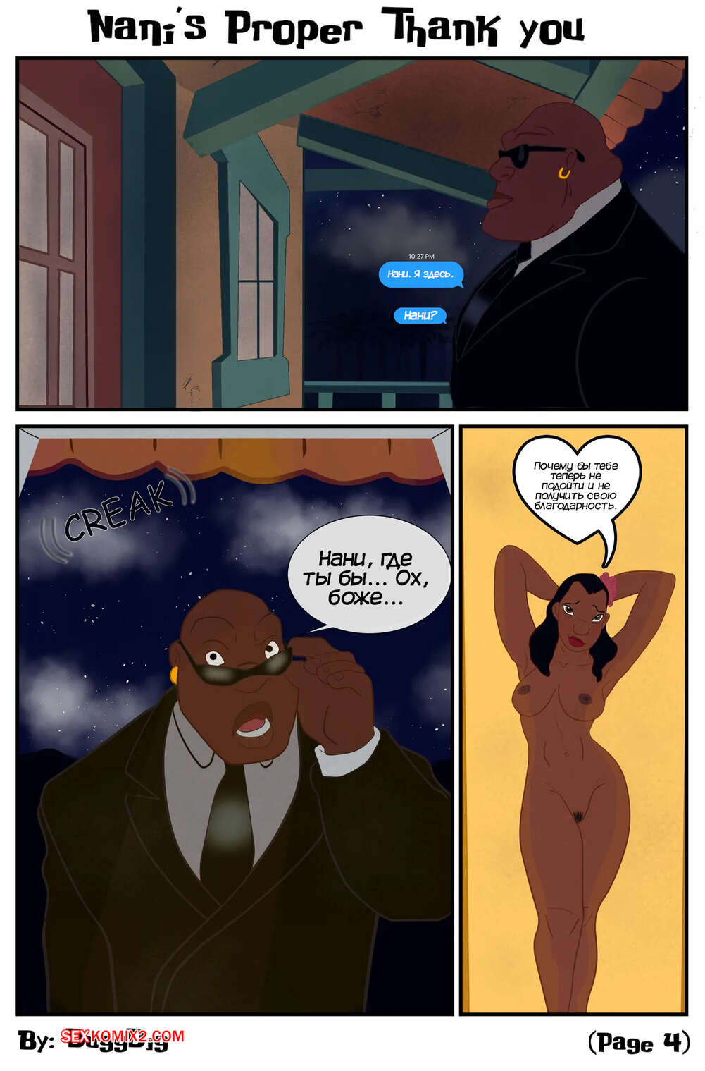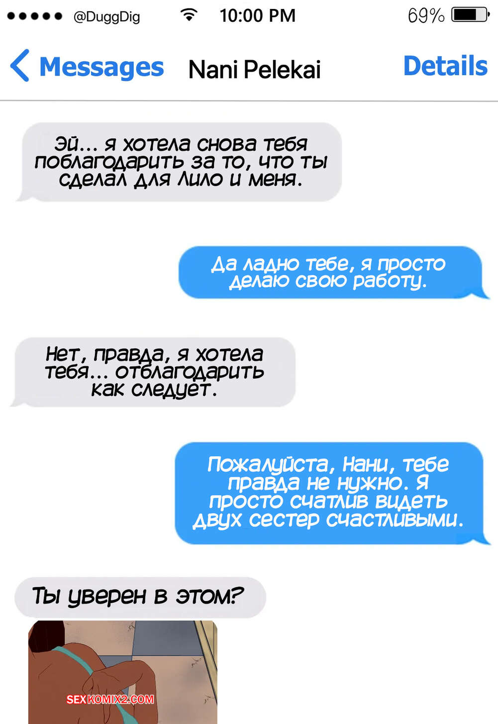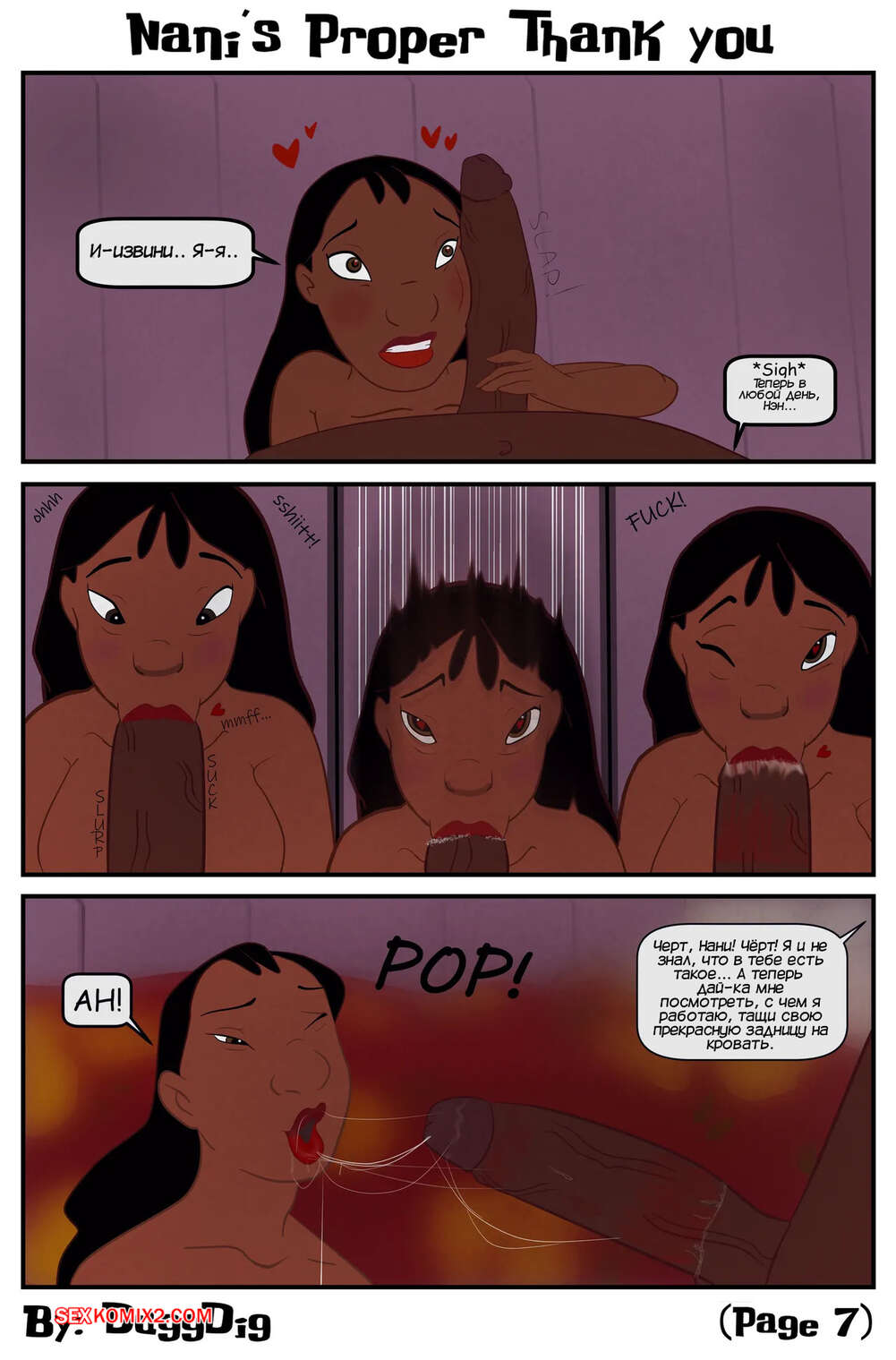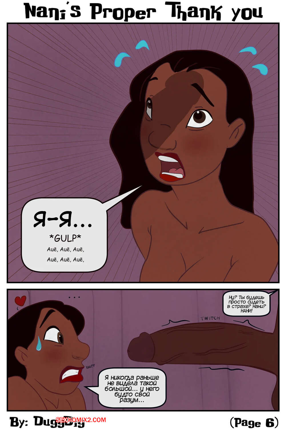 Порно комикс Лило и Стич. Надлежащая благодарность Нани. Nanis Proper Thank You. DuggDig. Горячая красотка Нани хочет отблагодарить своего темнокожего дружка как следует и стала отправлять ему откровенные фотографии. Парень не сдержался и пришел к девушке, где она отсосала его член и дала себя выебать.